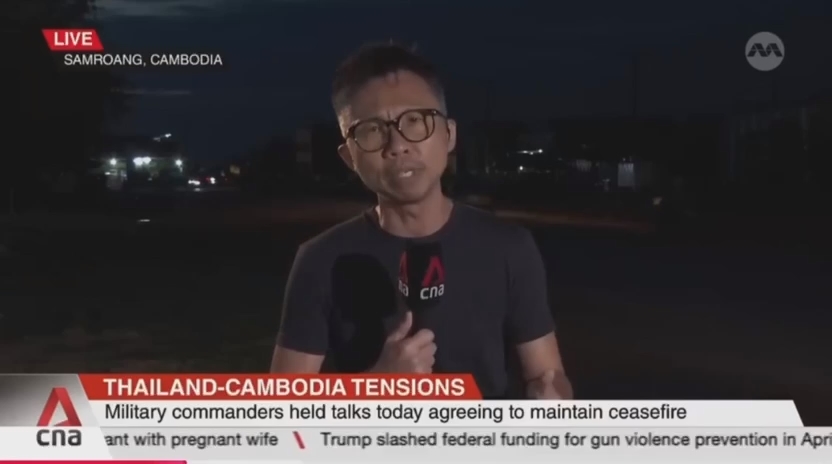 (ភ្នំពេញ)៖ អ្នកសារព័ត៌មានអន្តរជាតិរបស់ CNA ស្ថិតនៅប្រទេសសិង្ហបុរី បានរាយការណ៍ផ្ទាល់ពីតំបន់ព្រំដែនកម្ពុជា ដោយបដិសេធការចោទប្រកាន់របស់រដ្ឋាភិបាលថៃ ដែលអះអាងថា កម្ពុជាបានល្មើសនឹងបទឈប់បាញ់។