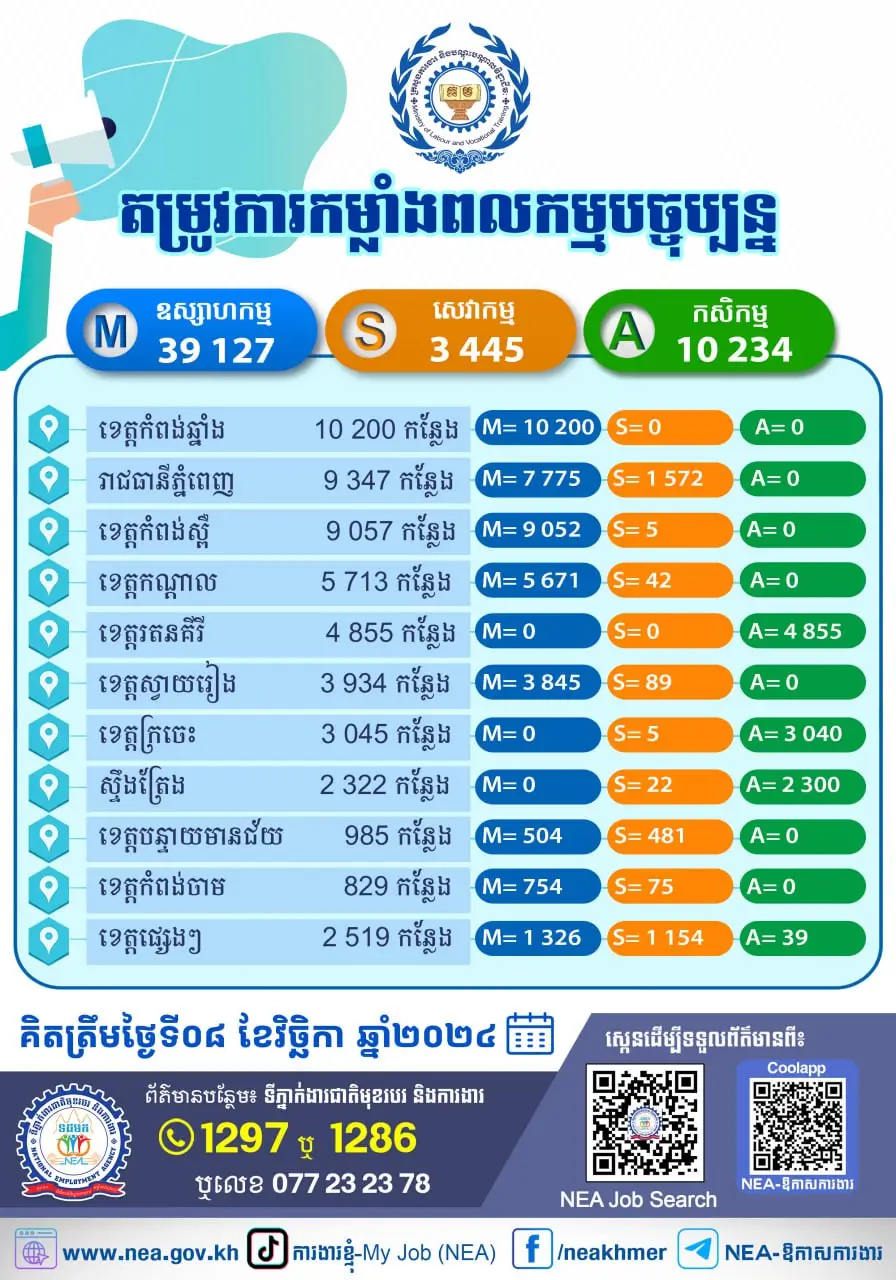 (ភ្នំពេញ)៖ កាលពីរសៀលថ្ងៃទី៨ ខែវិច្ឆិកា ឆ្នាំ២០២៤ ទីភ្នាក់ងារជាតិមុខរបរ និងការងារ នៃក្រសួងការងារ និងបណ្តុះបណ្តាលវិជ្ជាជីវៈ បានចេញសេចក្ដីប្រកាស ស្ដីពីការផ្ដល់ឱកាសការងារដល់យុវជន សិស្ស និស្សិត និងសាធារណជន ដែលមិនទាន់មានការងារ និងកំពុងស្វែងរកការងារ ជាច្រើនកន្លែង។