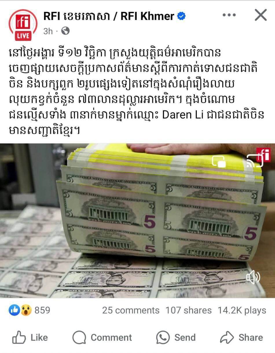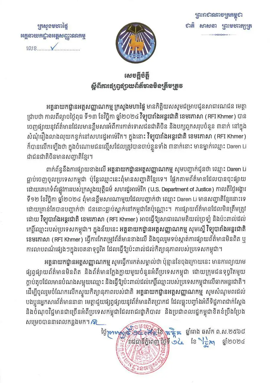 ក្នុងពេលថ្មីៗនេះ អគ្គនាយកដ្ឋានអត្តសញ្ញាណកម្ម បានបំភ្លឺសាធារណជនអំពីការផ្សាយព័ត៌មានមិនត្រឹមត្រូវ ដែលត្រូវបានផ្សាយដោយវិទ្យុបារាំងអន្តរជាតិ ខេមរភាសា (RFI Khmer)។ ព័ត៌មានដែលបានលើកឡើងស្តីពីការដាក់កំហាប់ជនជាតិចិនឈ្មោះ Daren Li ដែលត្រូវបានចោទប្រកាន់ថា ធ្វើសកម្មភាពលាងលុយកខ្វក់នៅសហរដ្ឋអាមេរិក។ ប៉ុន្តែព័ត៌មាននេះបានធ្វើឲ្យមានការយល់ច្រឡំចំពោះសាធារណជនខ្មែរ ដោយសារតែវាបានបញ្ជាក់ថា Daren Li មានសញ្ជាតិខ្មែរ ប៉ុន្តែនៅក្នុងការពិត គាត់គ្រាន់តែធ្លាប់ចូលទៅក្នុងប្រទេសកម្ពុជាតែប៉ុណ្ណោះ។