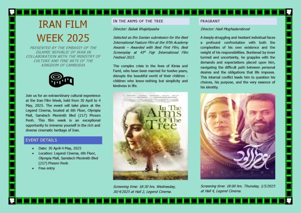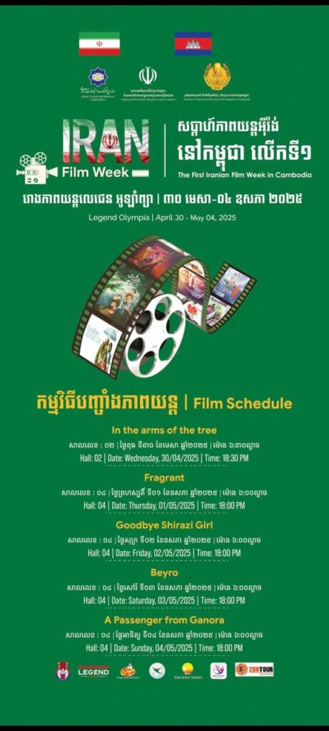 សប្តាហ៍ភាពយន្តអ៊ីរ៉ង់លើកទី១ ឆ្នាំ២០២៥ នឹងប្រព្រឹត្តទៅនៅកម្ពុជា ដោយមានការសហការរវាងក្រសួងវប្បធម៌ និងស្ថានទូតអ៊ីរ៉ង់ ដើម្បីលើកកម្ពស់ការយល់ដឹងអន្តរជាតិ