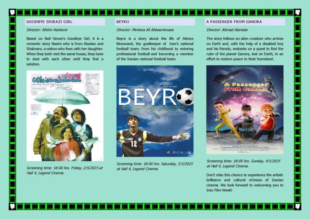 ភាពយន្តដែលបានជ្រើសរើសសម្រាប់ការចាក់បញ្ចាំងគឺ បង្ហាញអំពីប្រធានបទនៃក្ដីស្រឡាញ់ គ្រួសារ និងការតស៊ូផ្ទាល់ខ្លួន។ ពួកវានឹងផ្តល់ឱ្យទស្សនិកជននូវទិដ្ឋភាពថ្មីៗអំពីជីវិតប្រចាំថ្ងៃ និងគុណតម្លៃសង្គមរបស់ប្រទេសអ៊ីរ៉ង់ដែលមិនសូវត្រូវបានស្គាល់ទូលំទូលាយនៅតំបន់អាស៊ីអាគ្នេយ៍។