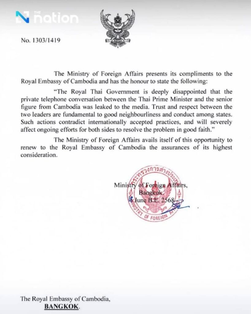 ក្រសួងការបរទេសថៃ បានកោះហៅឯកអគ្គរាជទូតកម្ពុជាប្រចាំប្រទេសថៃ នៅថ្ងៃព្រហស្បតិ៍ទី១៩ខែមិថុនាឆ្នាំ២០២៥នេះ ដើម្បីតវ៉ាជាផ្លូវការ ទាក់ទងនឹងការបែកធ្លាយការសន្ទនា ជាលក្ខខណៈឯកជន រវាងនាយករដ្ឋមន្ត្រីថៃ លោកស្រីផែថងថាន ស៊ីណាវ៉ាត្រានិងសម្តេច ហ៊ុន សែនប្រធានព្រឹទ្ធសភាកម្ពុជា។ នេះបើតាមការចុះផ្សាយដោយសារព័ត៌មានThe Nation នៅថ្ងៃព្រហស្បតិ៍នេះ។